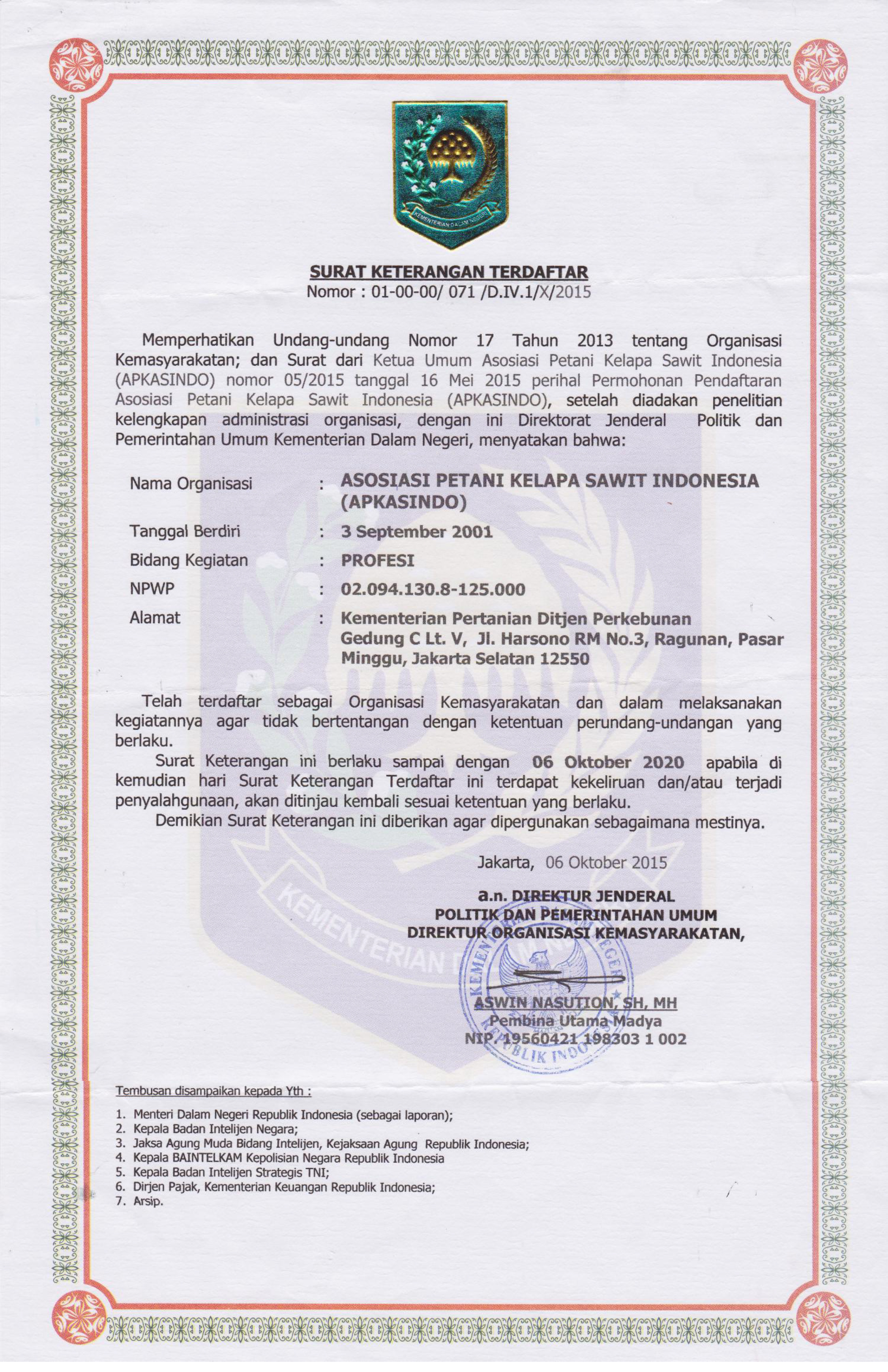 -APKASINDO Terdaftar di Kementerian Dalam Negeri cq Direktur Jenderal Politik dan Pemerintahan Umum sebagai organisasi kemasyarakatan profesi.